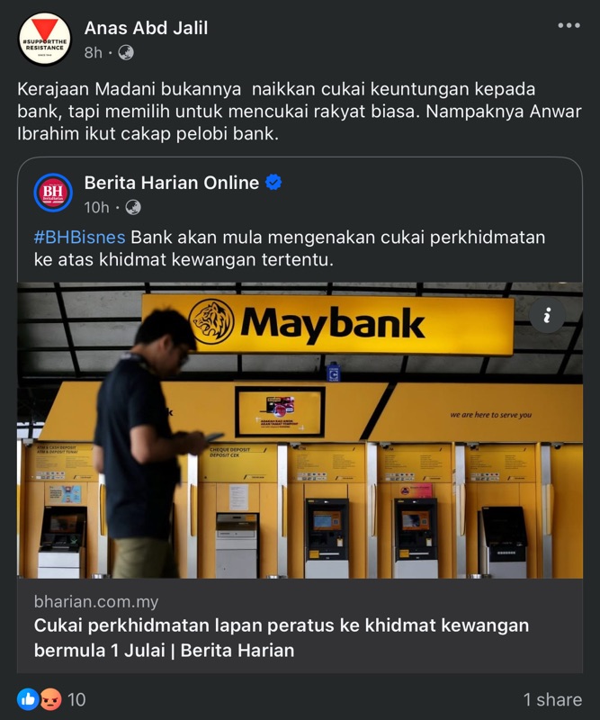 Pada 25 Jun 2025 (semalam), portal berita arus perdana itu melaporkan bank-bank di Malaysia akan mula mengenakan cukai perkhidmatan sebanyak lapan peratus ke atas perkhidmatan kewangan tertentu yang dikenakan yuran dan komisen bermula 1 Julai ini.