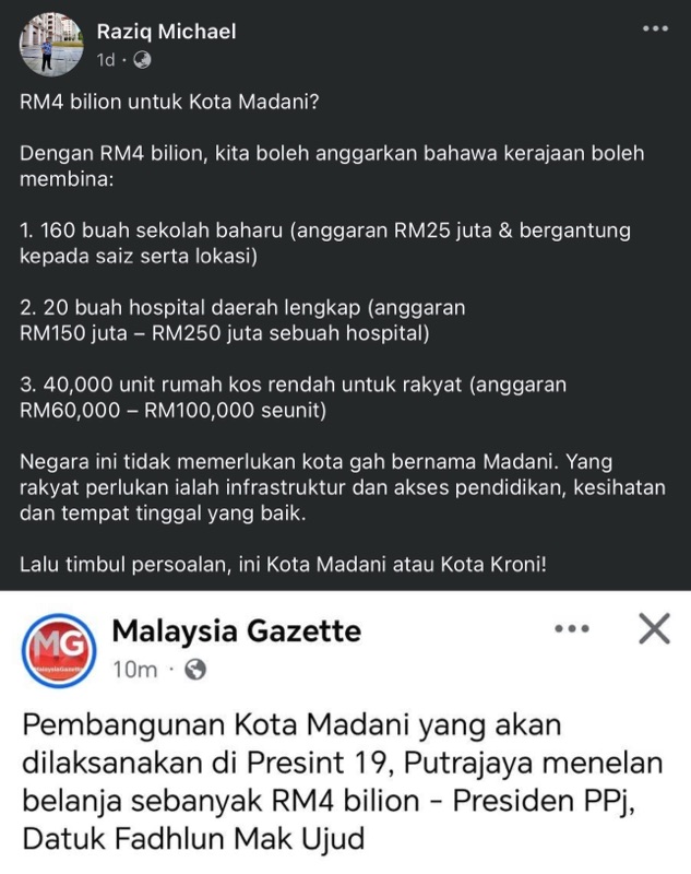 Berbalik pada penjelasan Menteri, Kota MADANI dekat Putrajaya itu tidak akan melibatkan wang rakyat (baca: suntikan fiskal oleh Kerajaan Persekutuan).